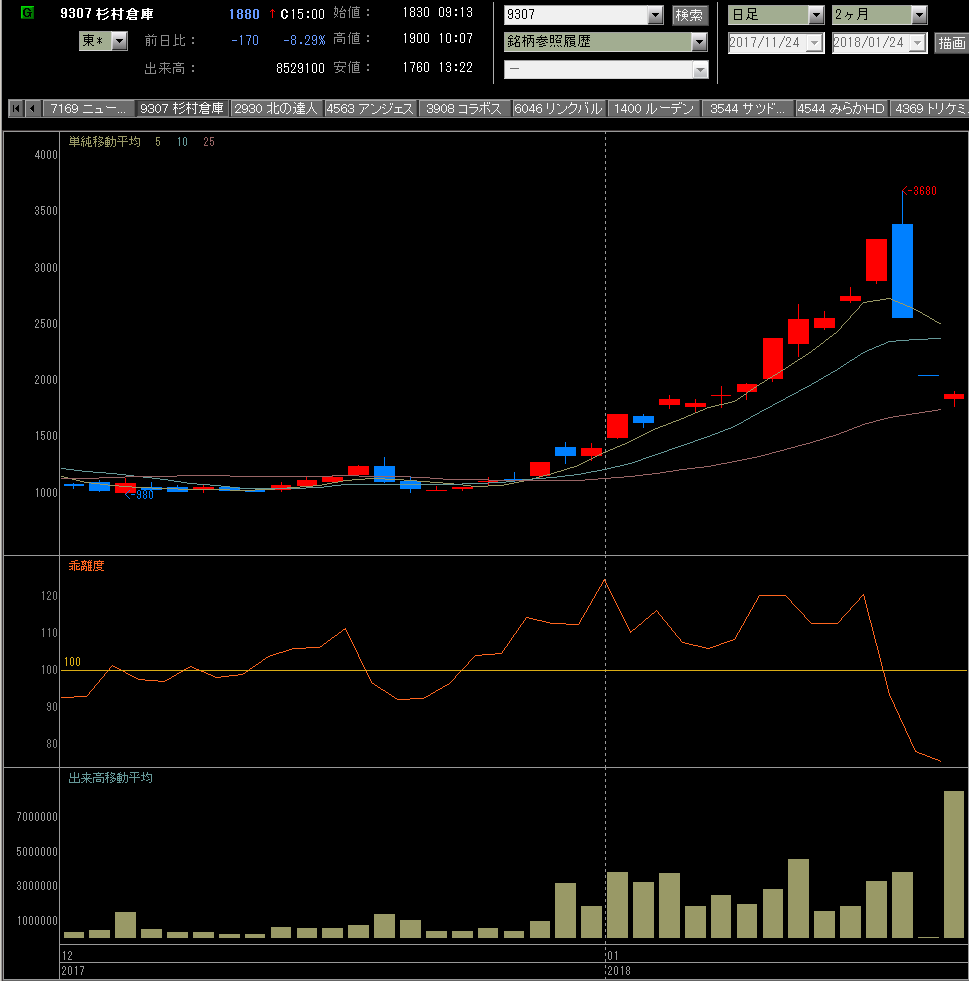 ようやく、杉村倉庫の恐怖から解放された。一撃で高値から約5割も下げるとは恐ろしい。ほんまに、いらんことしんとこ(T_T)