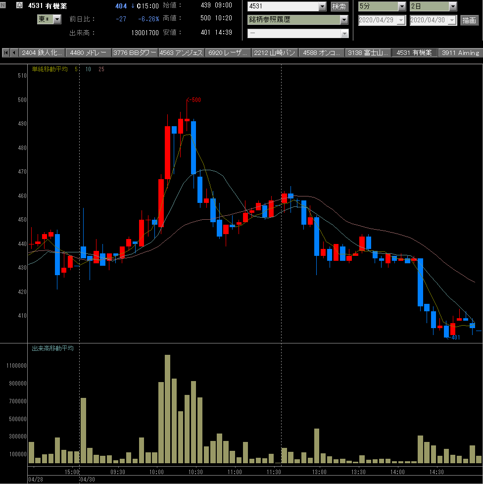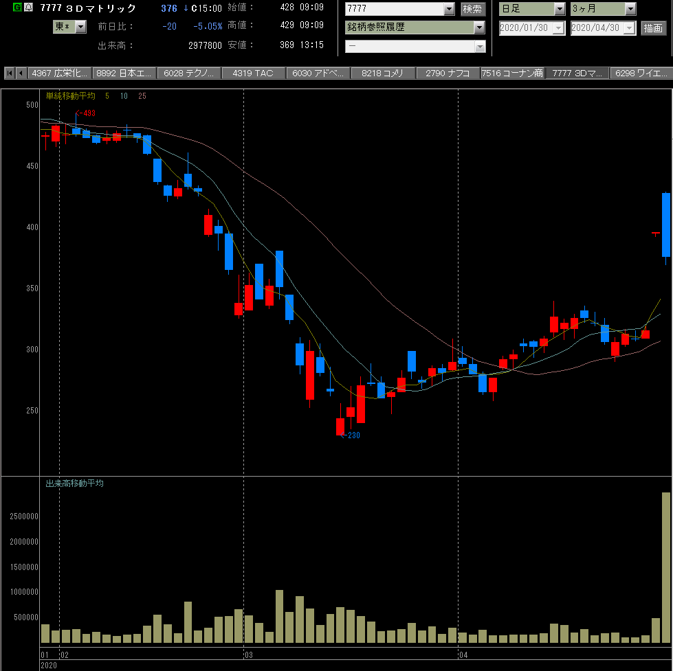今日もストップ高で空売りしないように心がけ臨むも、スリーディーマトリックスが寄り前気配でストップ高だったので材料を調べたら「新型コロナ抗体検査キットを開発」とのこと、検査キットなんてすでにいろんなとこが開発してるし寄り天確定やろと寄りで空売り!はい、秒で張付かれ約120倍の圧倒的買い長で引けられ、さらに今日の持越しはGW5連休含む恐怖の日計り空売り手数料6日分なことに気付き祝日明けの木曜日は爆損確定か・・・。材料がなんであれ、寄りでINするのはあかんよなあ(T_T)