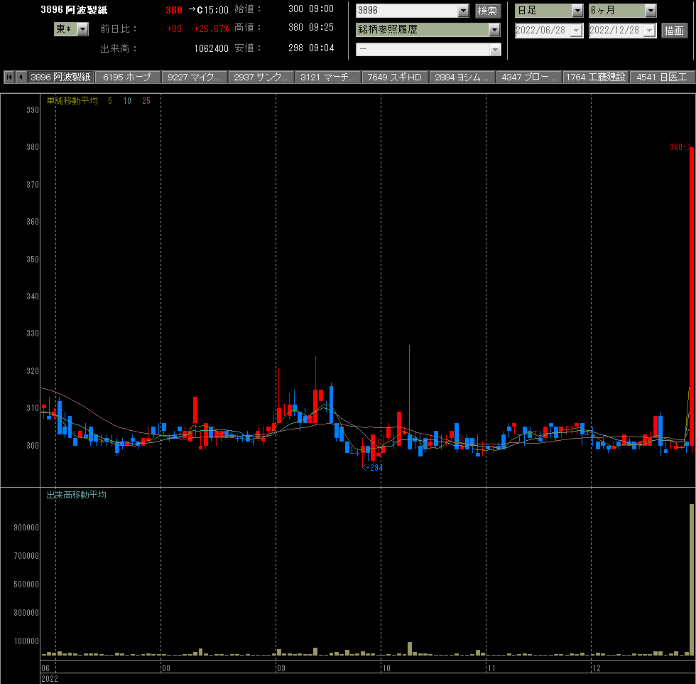 阿波製紙がザラバに材料ででストップ高、9:46を最後に剥がれず引ける。
