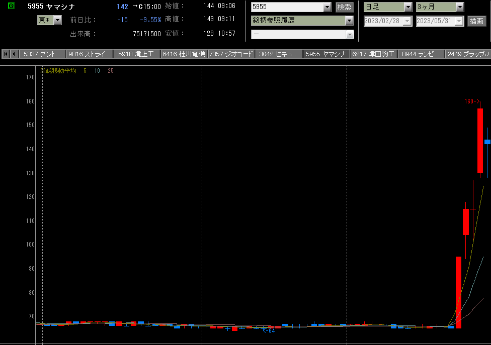 ヤマシナが大幅GDからの陰線引け。昨日が天井となるのか引き続き監視しとこ( ̄∠  ̄ )
