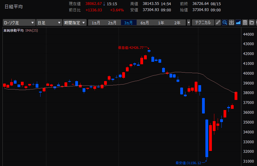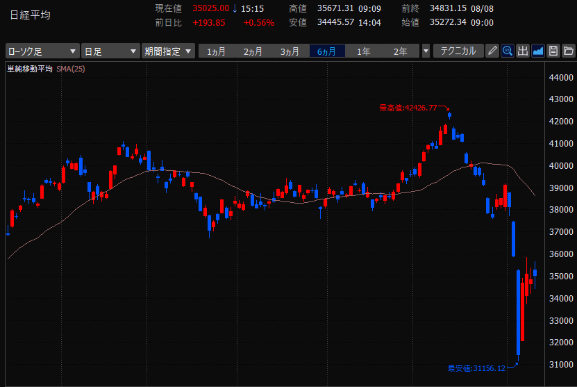 先週8/2金曜に日経平均が過去2番目となる下げ幅2216円を記録した翌営業日8/5月曜なんと過去最大下げ幅4451円!で、翌日8/6火曜に過去最大上げ幅3217円とハイボラ相場な1週間。
